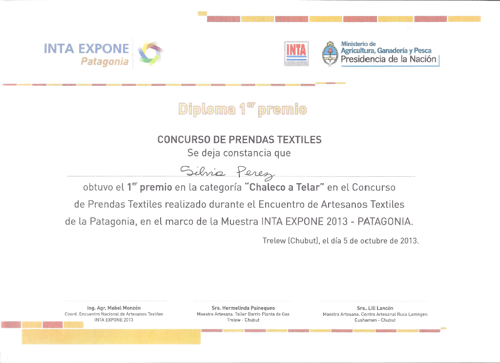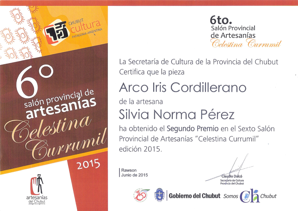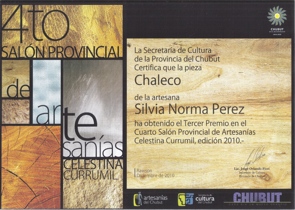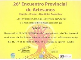 26º Encuentro Provincial de Artesanos. 16, 17 y 18 de Enero 2015 - Epuyen - Chubut. - Primer premio a la obra artesanal "Chaleco de Esquel".