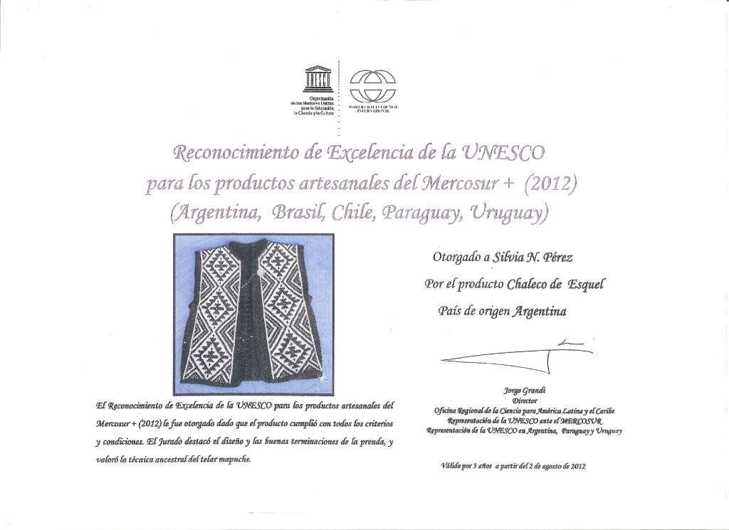 Reconocimiento de Excelencia de la UNESCO, para los productos artesanales del Mercosur - Pieza: Chaleco de Esquel.