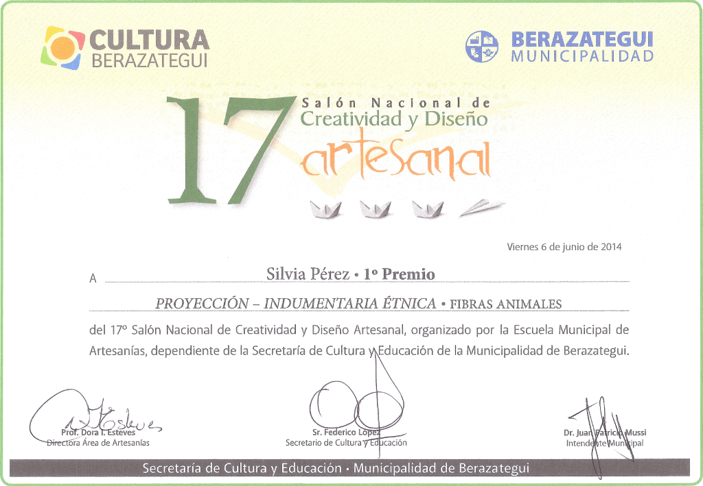 17º Salon Nacional de Creatividad y Diseño Artesanal. - Primer premio: Proyección Indumentaria en Telar, rubro fibras animales. Pieza: Chaleco de Esquel.