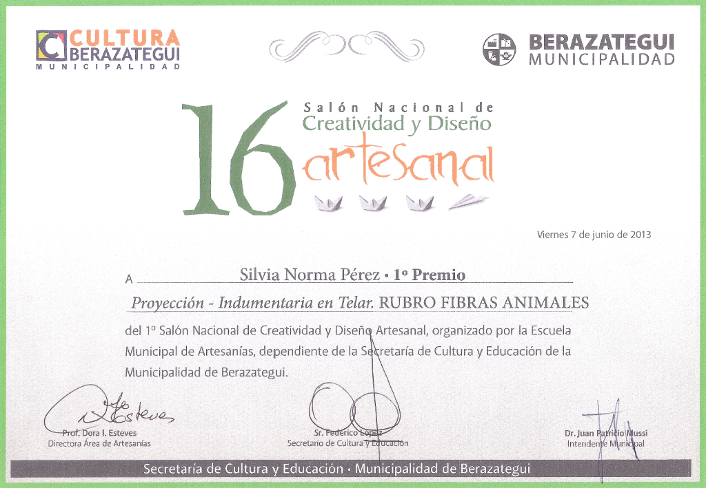 16º Salon Nacional de Creatividad y Diseño Artesanal. - Primer premio: Proyección Indumentaria en Telar, rubro fibras animales. Pieza: Chaleco de Esquel.